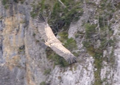 Walkers can see griffon vultures (buitre leonardo in Spanish) when they are out in the mountains. Circling high overhead, riding the thermals, they are the most common large bird in the high Pyrenees. They are recognisable by their huge wingspan of 2.4–2.8 metres with black feathers on the outer section, and their white heads and necks.
