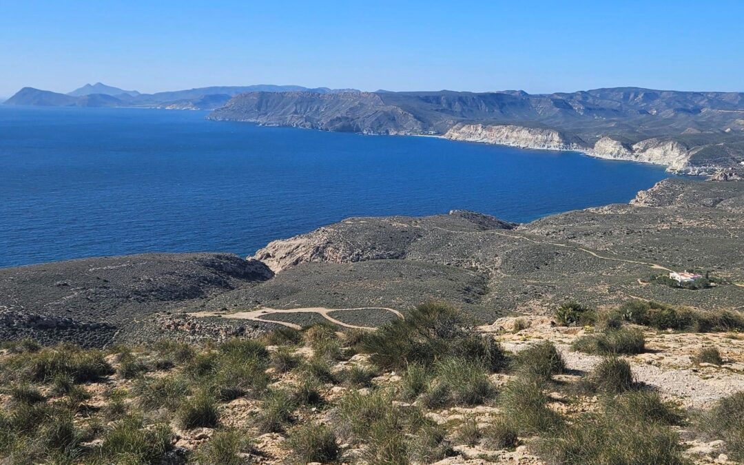 The ascent offers a first view along the mountainous coastline of the Cabo de Gata. It’s an extraordinary vista taking in the coves, cliffs and headlands; and the distant twin-peaked volcano of Los Frailes (also extinct).