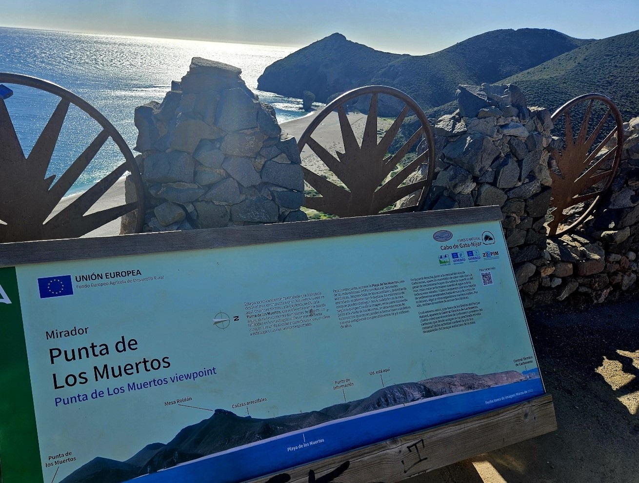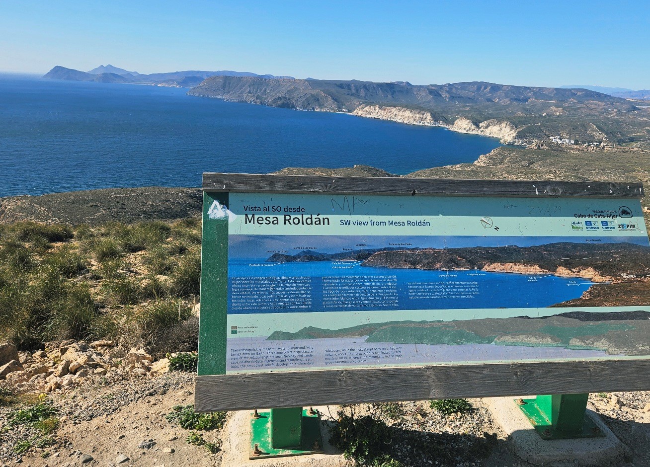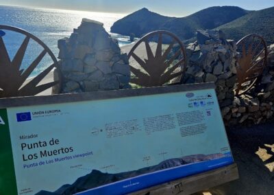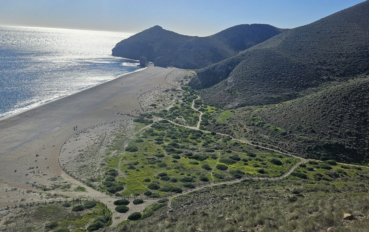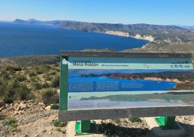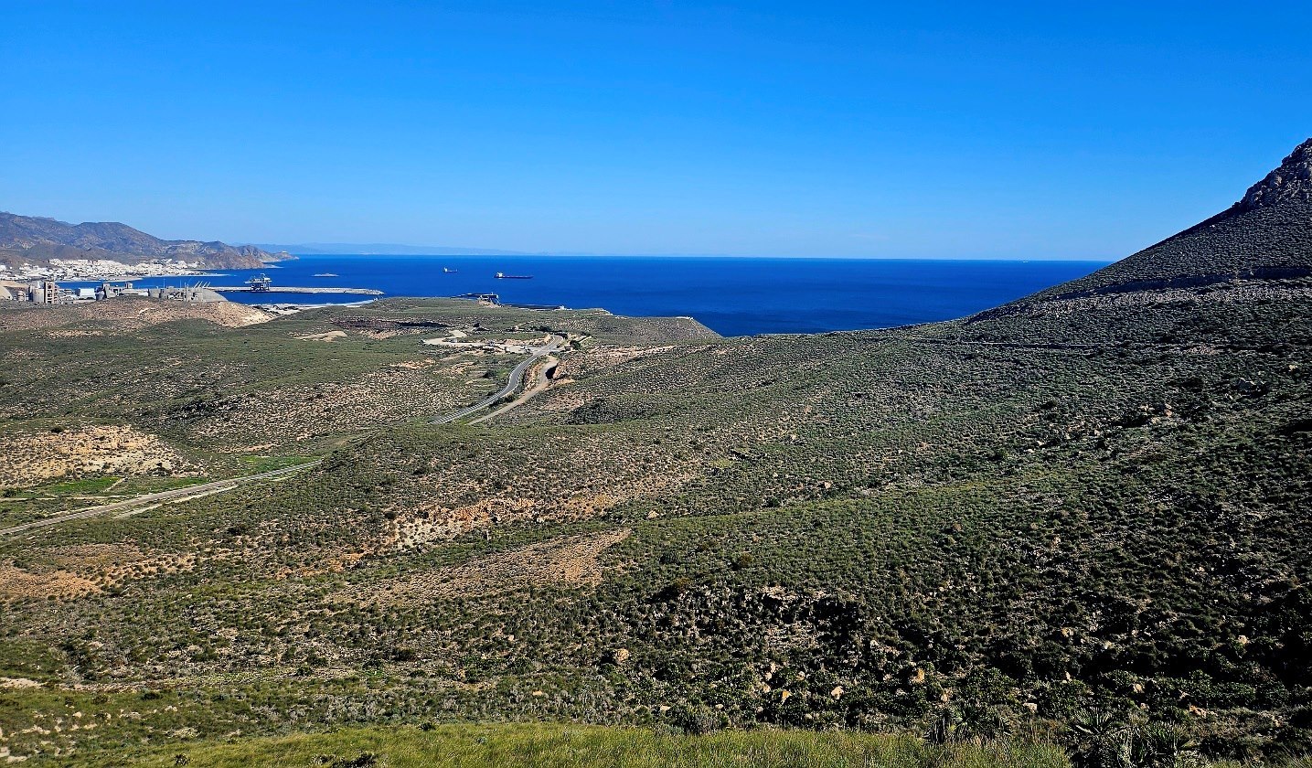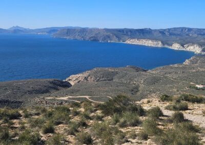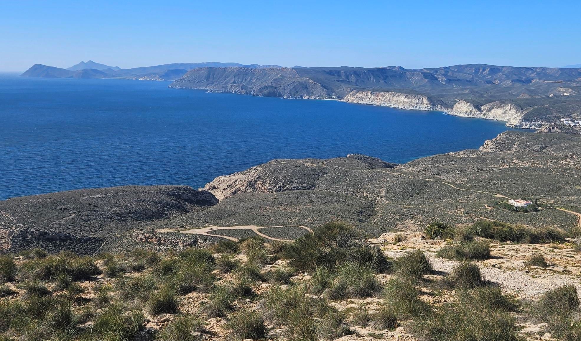 The ascent offers a first view along the mountainous coastline of the Cabo de Gata. It’s an extraordinary vista taking in the coves, cliffs and headlands; and the distant twin-peaked volcano of Los Frailes (also extinct).