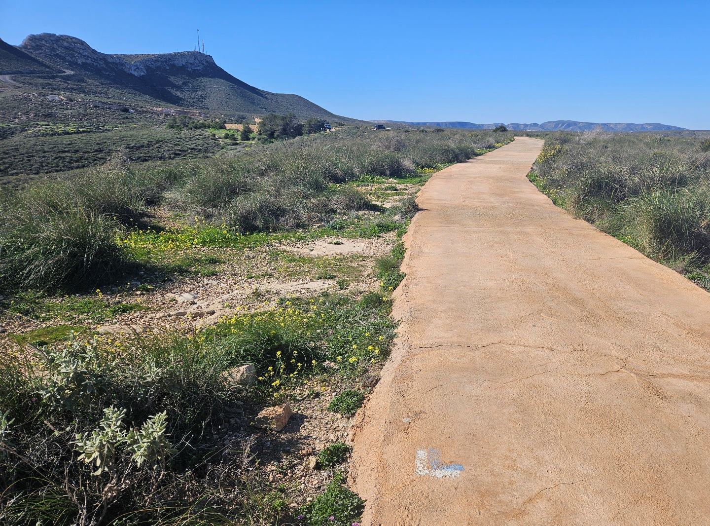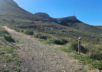 It’s a gradual climb. The track goes around the hillside and up the Mesa Roldán. There are great views back towards Carboneras as height is gained.