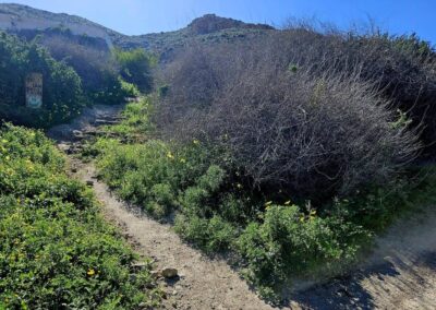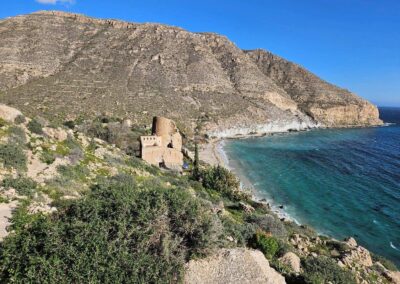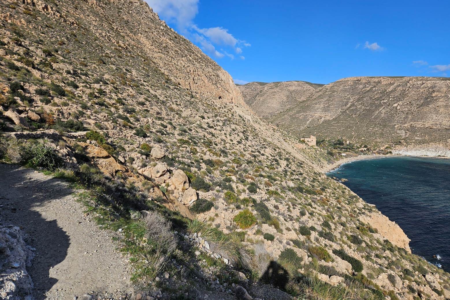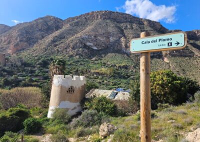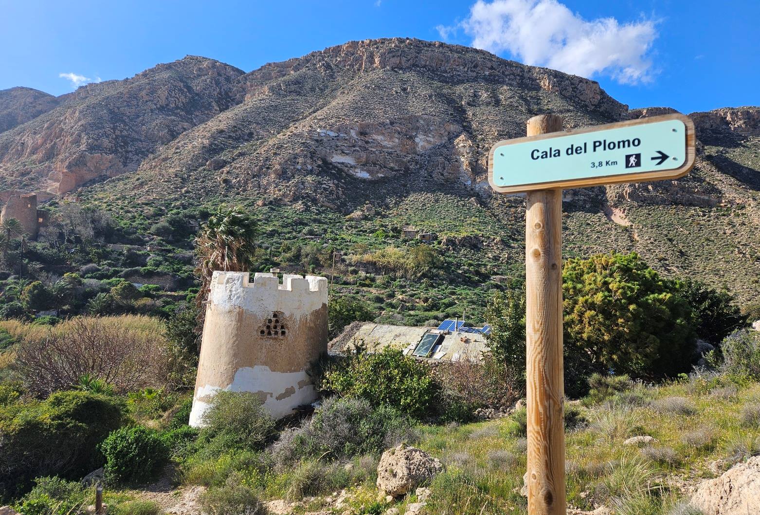 After enjoying the view, there is just over 200m of height to lose on the path down to San Pedro. It’s a winding descent which comes out at a small tower-like structure. Here, a sign points back to Cala del Plomo (3.8km distant).