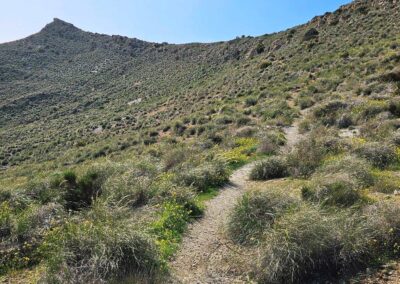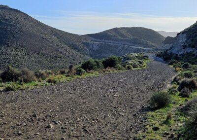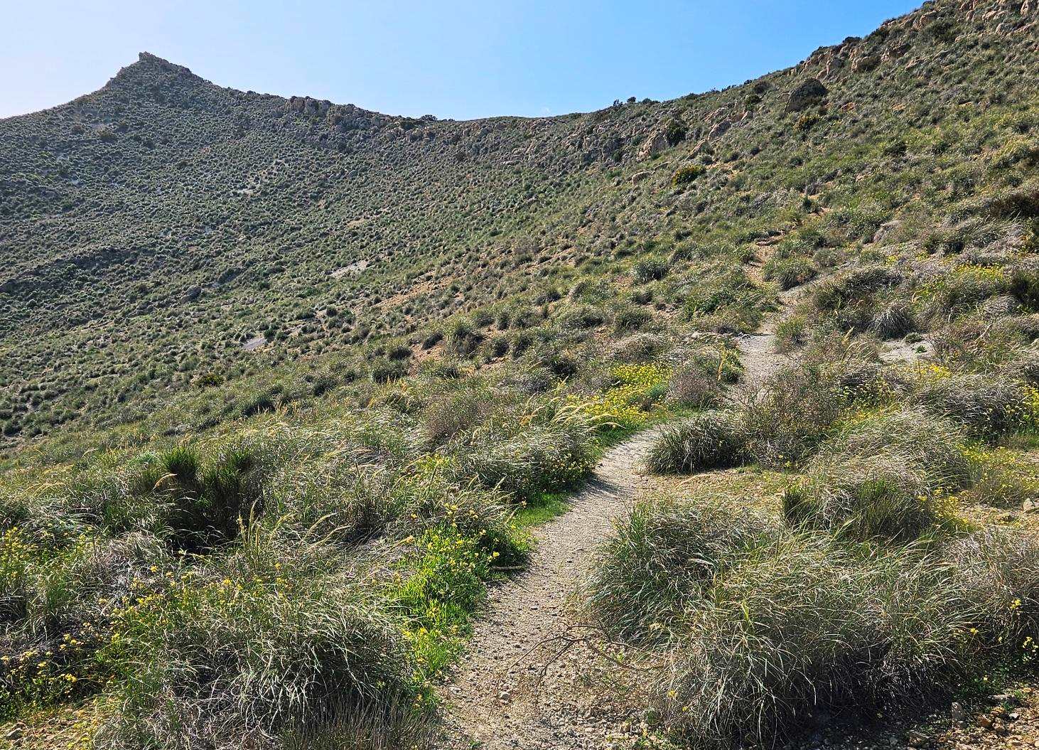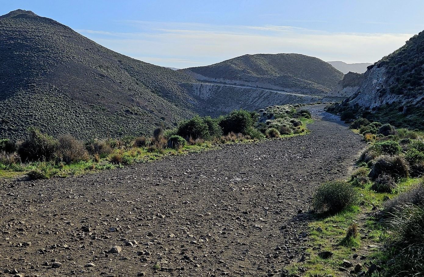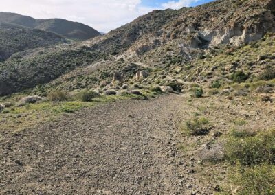It is now a wide track which goes to Las Negras. En route you can admire the volcanic rock formations to the left.