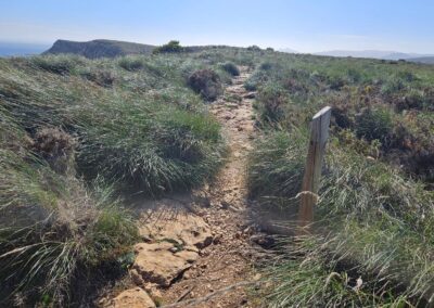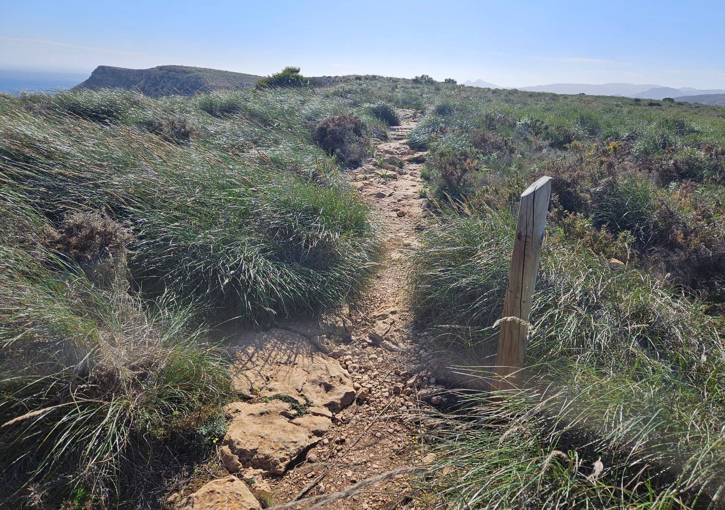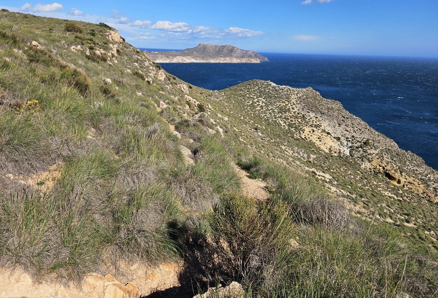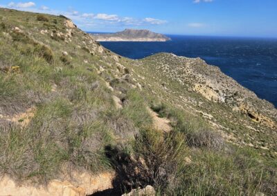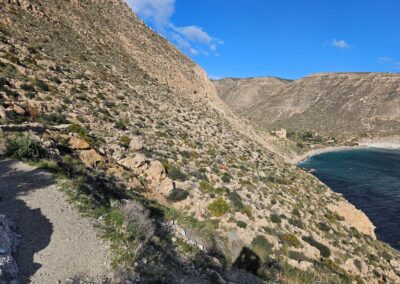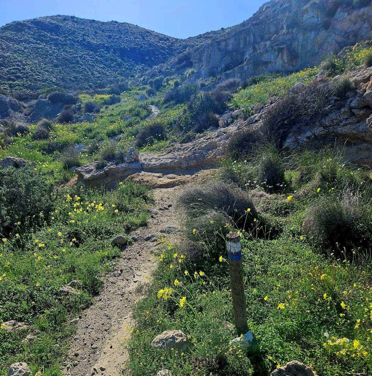 To get on the hill path to Cala de San Pedro we head back out of Cala del Plomo on the same route and turn left along the track, following the white/blue waymarks.