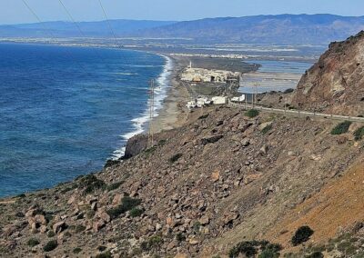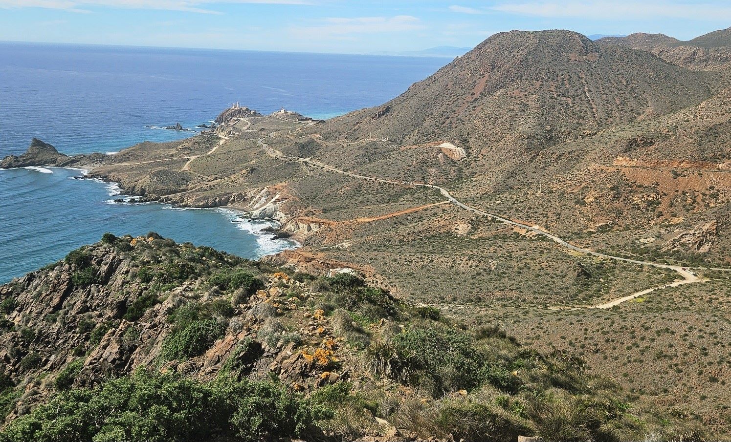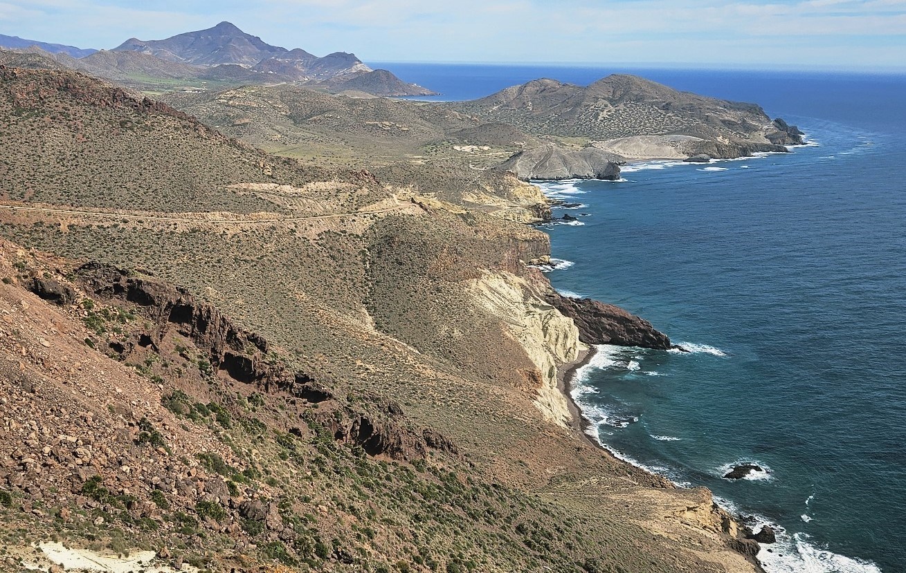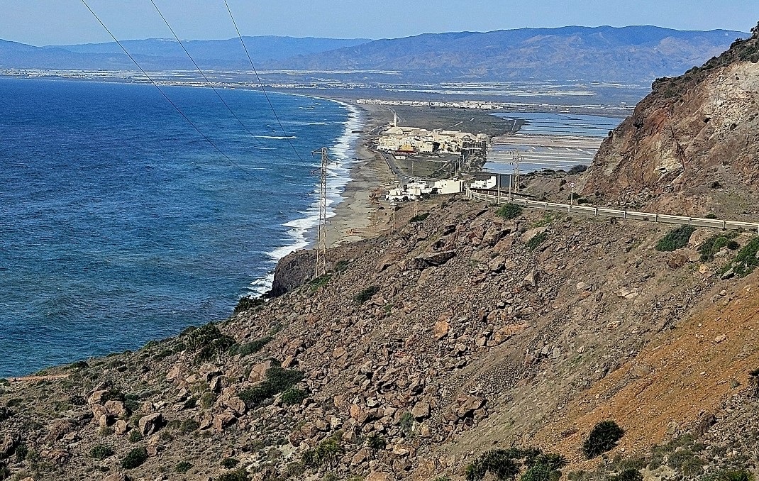 It’s a steady climb at first. Once the ascent is out of the way, a new view appears. This one goes west; over the Cabo de Gata salt lagoons, along the coast and to the mountains in the far distance which may be snow-capped.