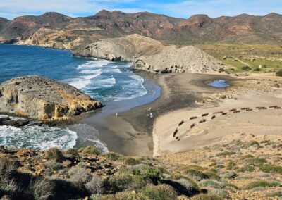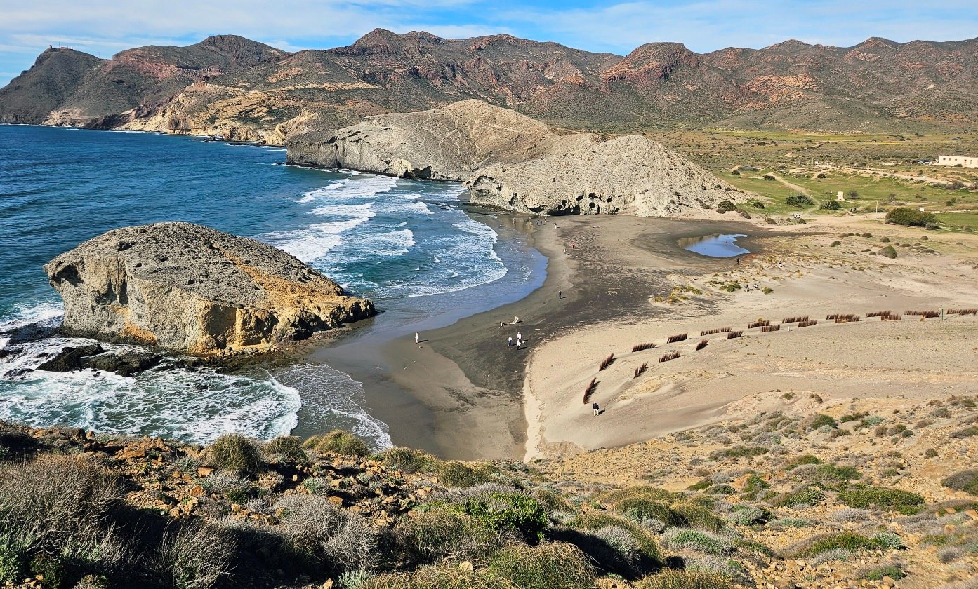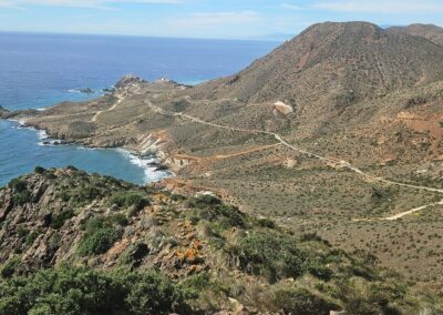 From the vantage point high above Playa de Mónsul, pick your way down the slope to the beach. The route moves slightly to the right on the descent.