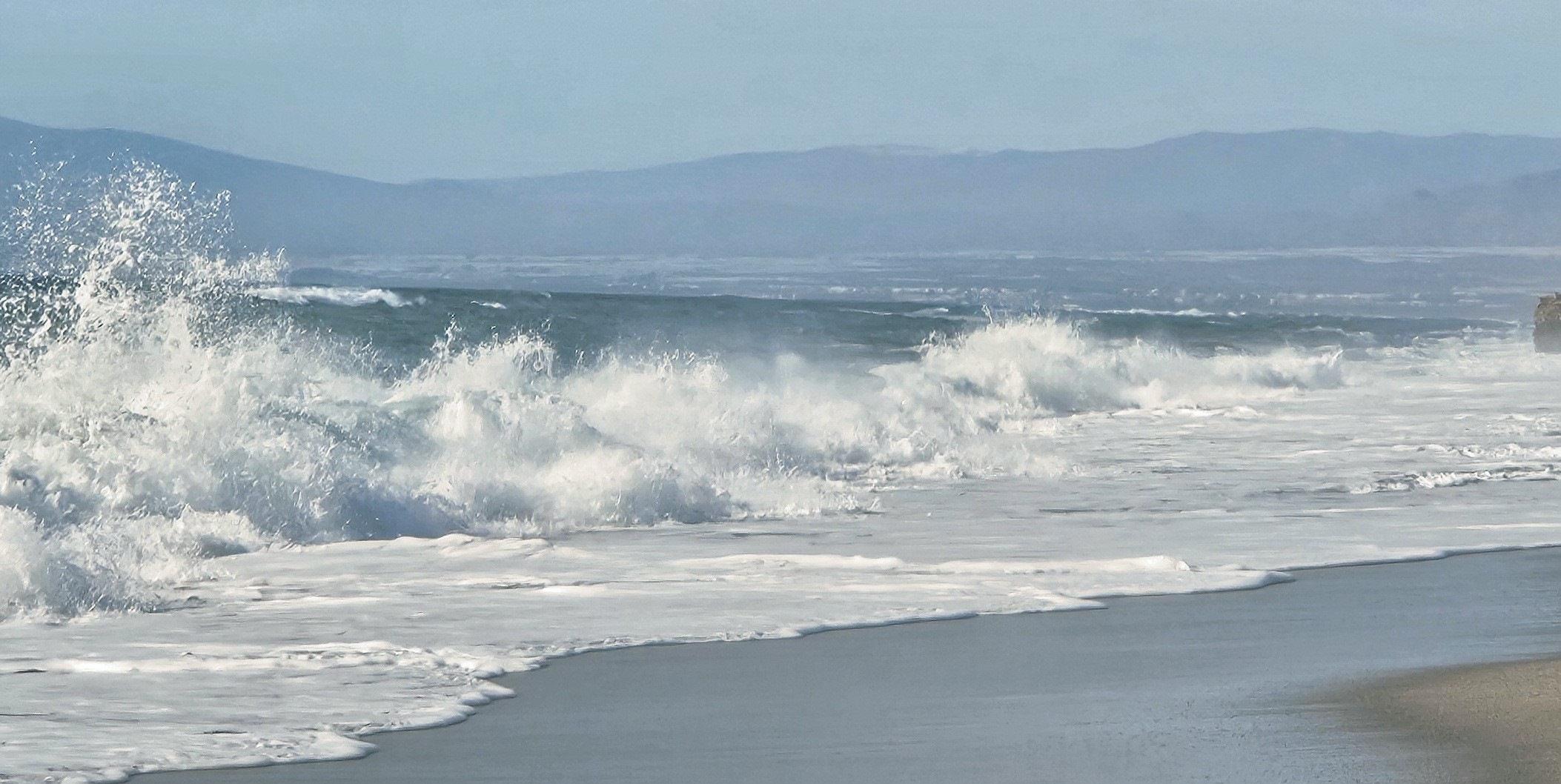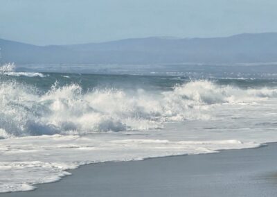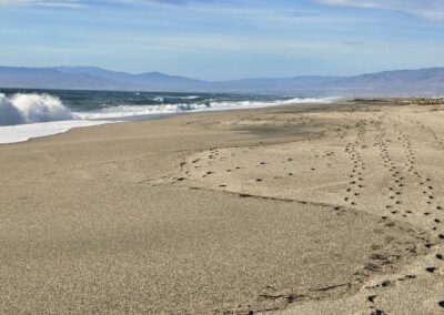It’s slow progress walking on the soft sand (there are very few hard bits!) but you will probably stick it out on the beach for a kilometre or two next to the crashing surf before moving across to head along the wide space next to the road.