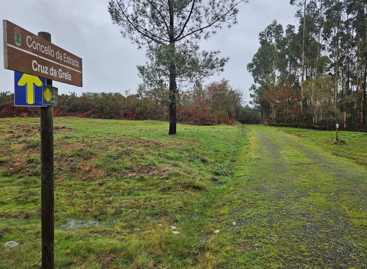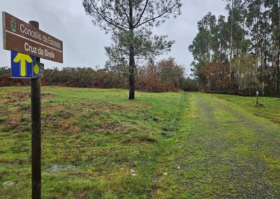 Follow the arrows, along a lane and then a track. At the top of the rise on the left, see the A Grela cross on its plinth, but our route doesn’t go that way.