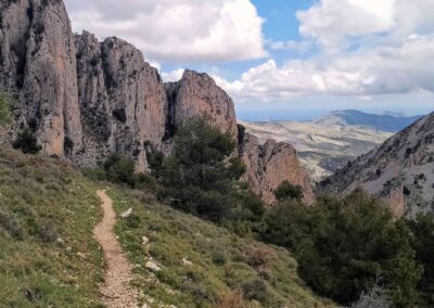Bear left at the well, following the sign that explains that it is just under 1km to the summit of Mallà del Llop. The path passes to the right of an impressive wall of rock which has deep fissures in its centre.