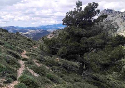 Around 50 metres into the descent, bear left to move out of the ravine, following the white/red waymarks. The path runs across the slope, away from the ravine; waymarks only appear intermittently.