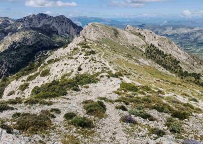 The path then embarks on a steeper ascent, going straight up. Keep a keen eye open for the waymarks. After the climbing, emerge at another lovely section. The path runs just below the ridge, heading directly towards the summit of Pla de la Casa in the distance.