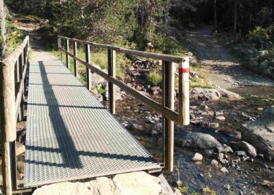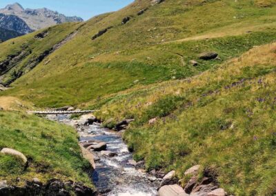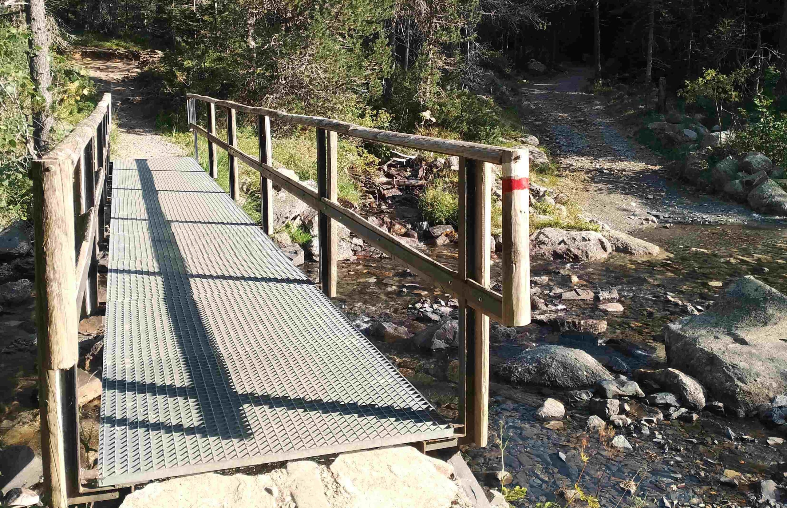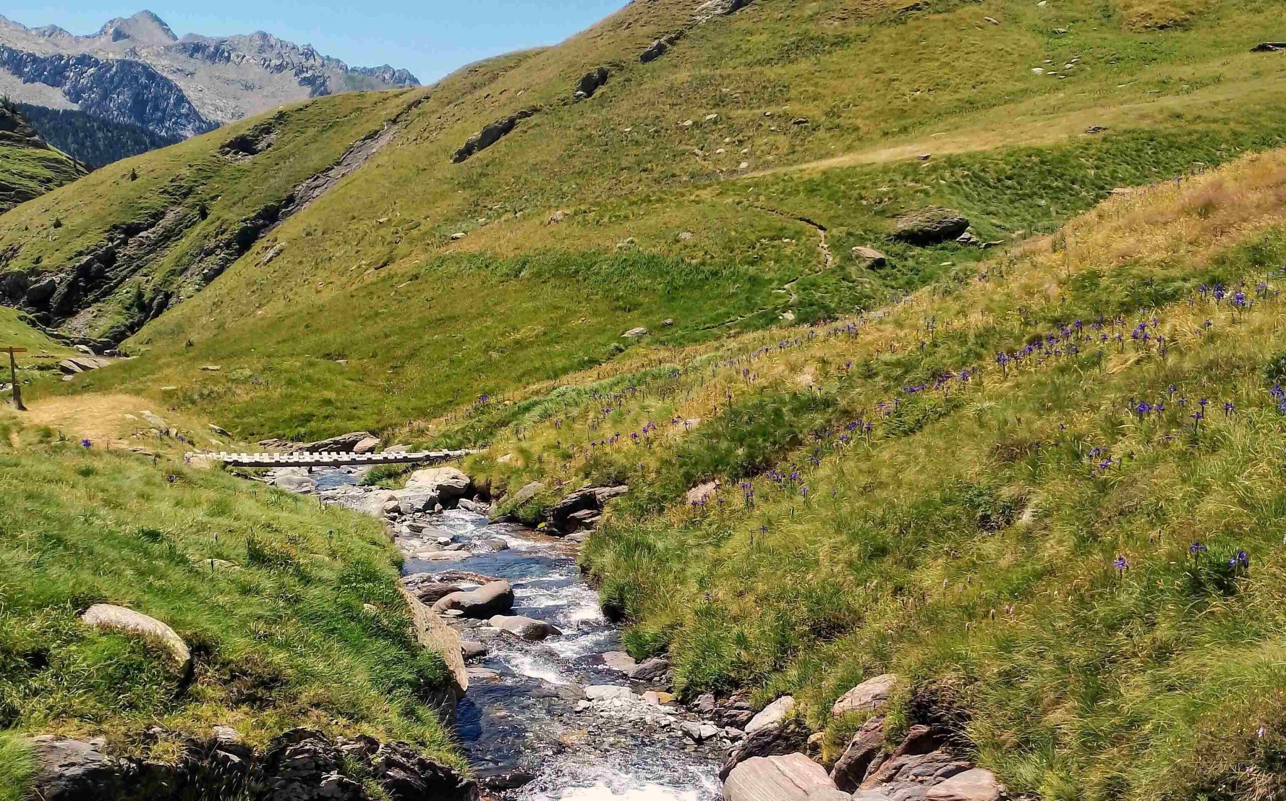 The track is now running high above the mountain river. After passing the Corones natural spring, the route crosses a footbridge over a tributary of the Estós.
