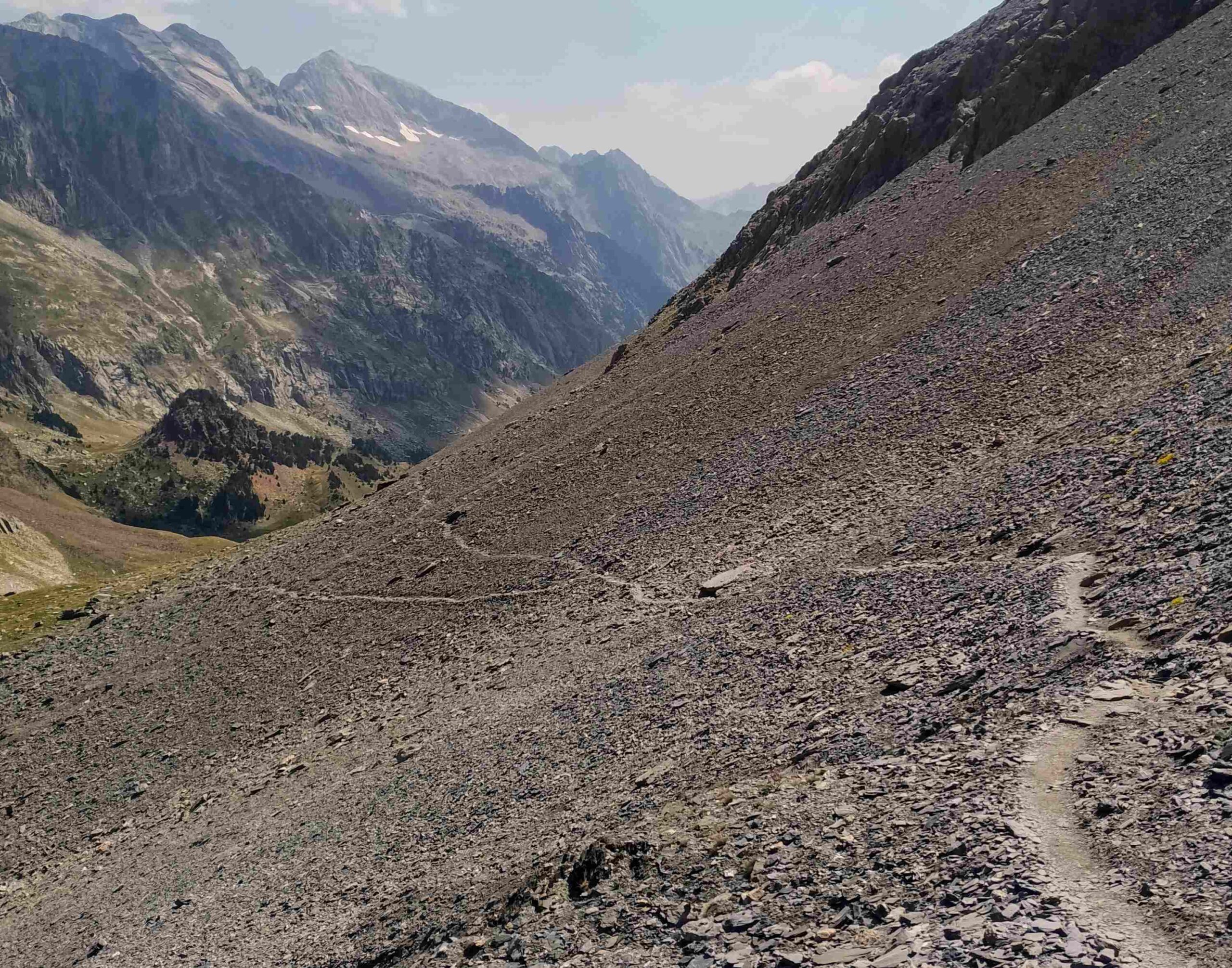 The GR-11 doglegs to the left to descend the Añes Cruces valley, with ever improving views of the Posets massif (on the left) and the fast shrinking glacier.