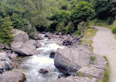 Most people will want to pause for a dip or a sit down in this lovely, grassy spot. Footbridges cross the first two streams; hop over the third one.