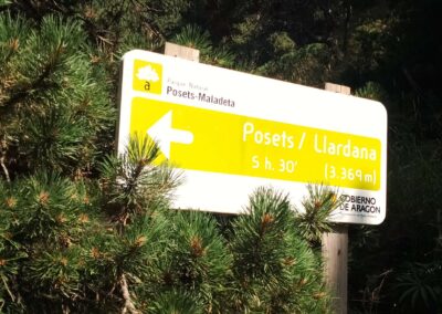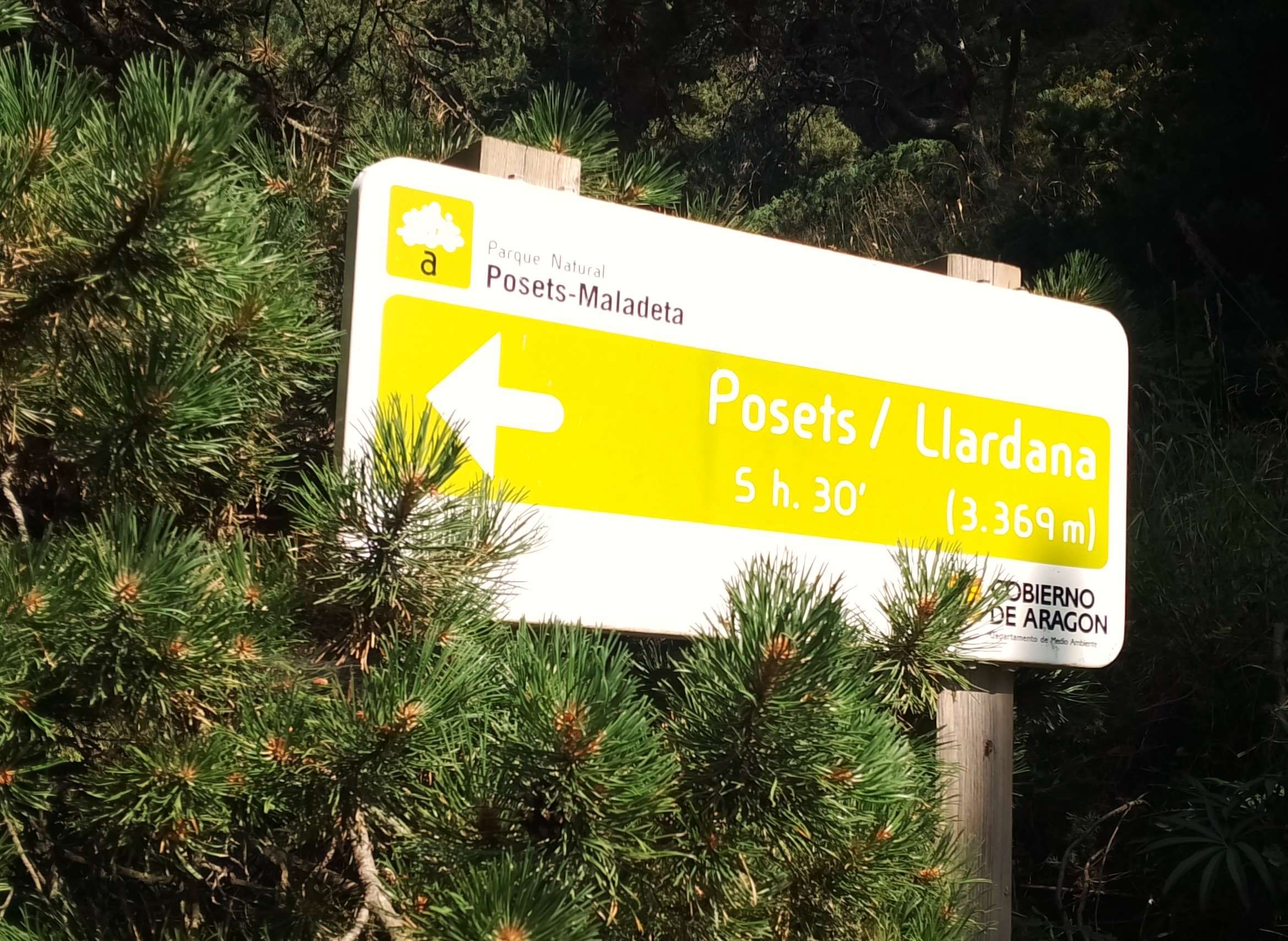 Shortly afterwards, a sign indicates the turn-off for the arduous route to the summit of Posets (the sign has the peak at 3,369m, while the Editorial Alpina map has 3,375m; such discrepancies are very common, almost obligatory, in this country).