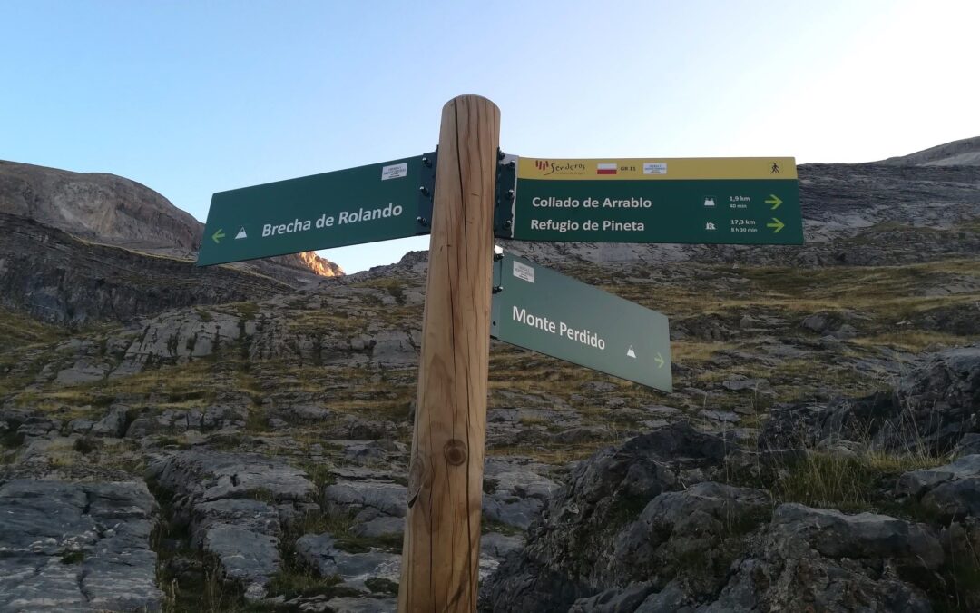 After overnighting at the Góriz mountain refuge – be it in a tent outside, or on a bunk inside – there are mouthwatering possibilities to choose from; after breakfast has been consumed, of course. Three of them are shown on a signpost, a photo of which appears on the reel below. The route outlined here follows a stage of the GR-11 footpath, which heads over to the Pineta valley.