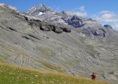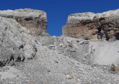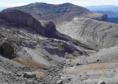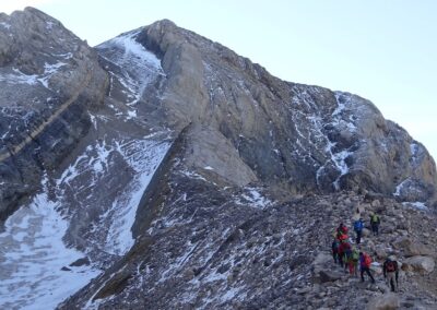 An early start from Góriz is helpful – and not as difficult as it sounds as mountaineers will be up and about at the refuge long before dawn to start out on their ascent of Monte Perdido (3,355 metres). Góriz stands at 2,200m and it’s just 1.9km up to the first pass – the Collado de Arrablo at 2,343m. This is a pleasant and easy start to the day, with awesome views back towards the ice-sculpted Góriz cirque and the 3,000-metre peaks which form a wall of rock above it.