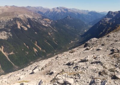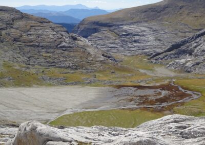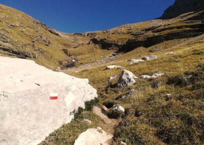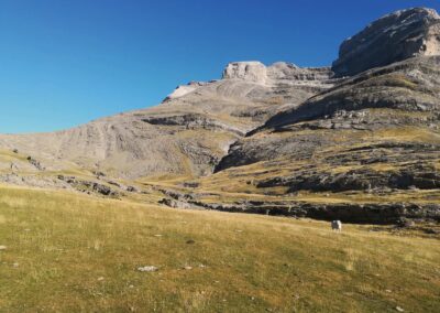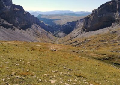 The path continues on and up, bearing slightly to the left, before doglegging right to reach the Collado de Añisclo pass at 2,453m. The views from here back down the Añisclo canyon are spectacular. Looking over the other side into the Pineta valley is also an extraordinary sight. But your heart will sink and legs will wobble as you contemplate the very long and steep descent that lies ahead to reach the valley floor 1,000 metres below. This has to be done if you are ever going to complete the full GR-11 route from start to finish (from the Bay of Biscay to the Mediterranean). However, this is not the day for the Pineta descent and the memory can be locked away for future adventures.