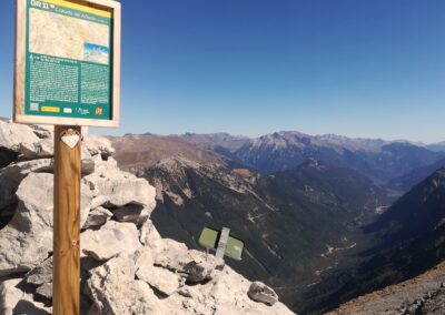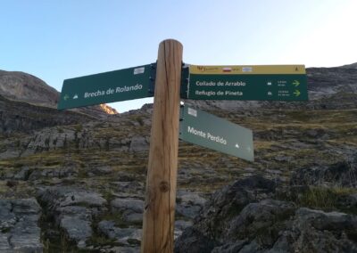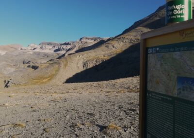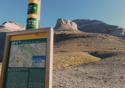 After overnighting at the Góriz mountain refuge – be it in a tent outside, or on a bunk inside – there are mouthwatering possibilities to choose from; after breakfast has been consumed, of course. Three of them are shown on a signpost, a photo of which appears on the reel below. The route outlined here follows a stage of the GR-11 footpath, which heads over to the Pineta valley.