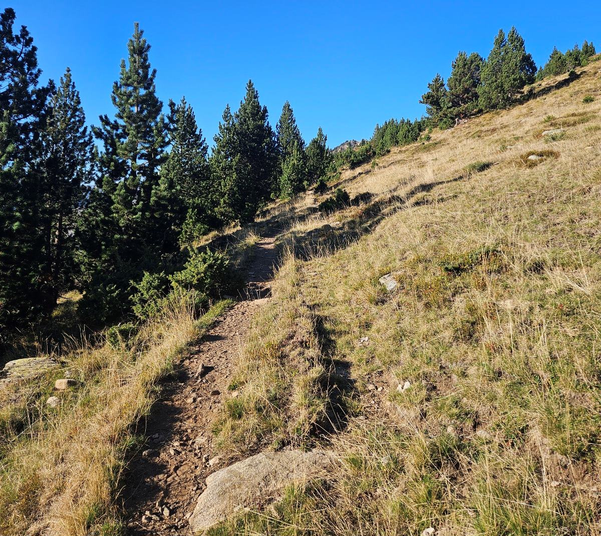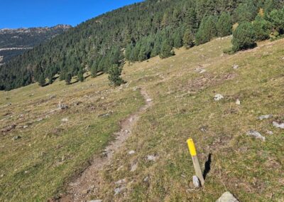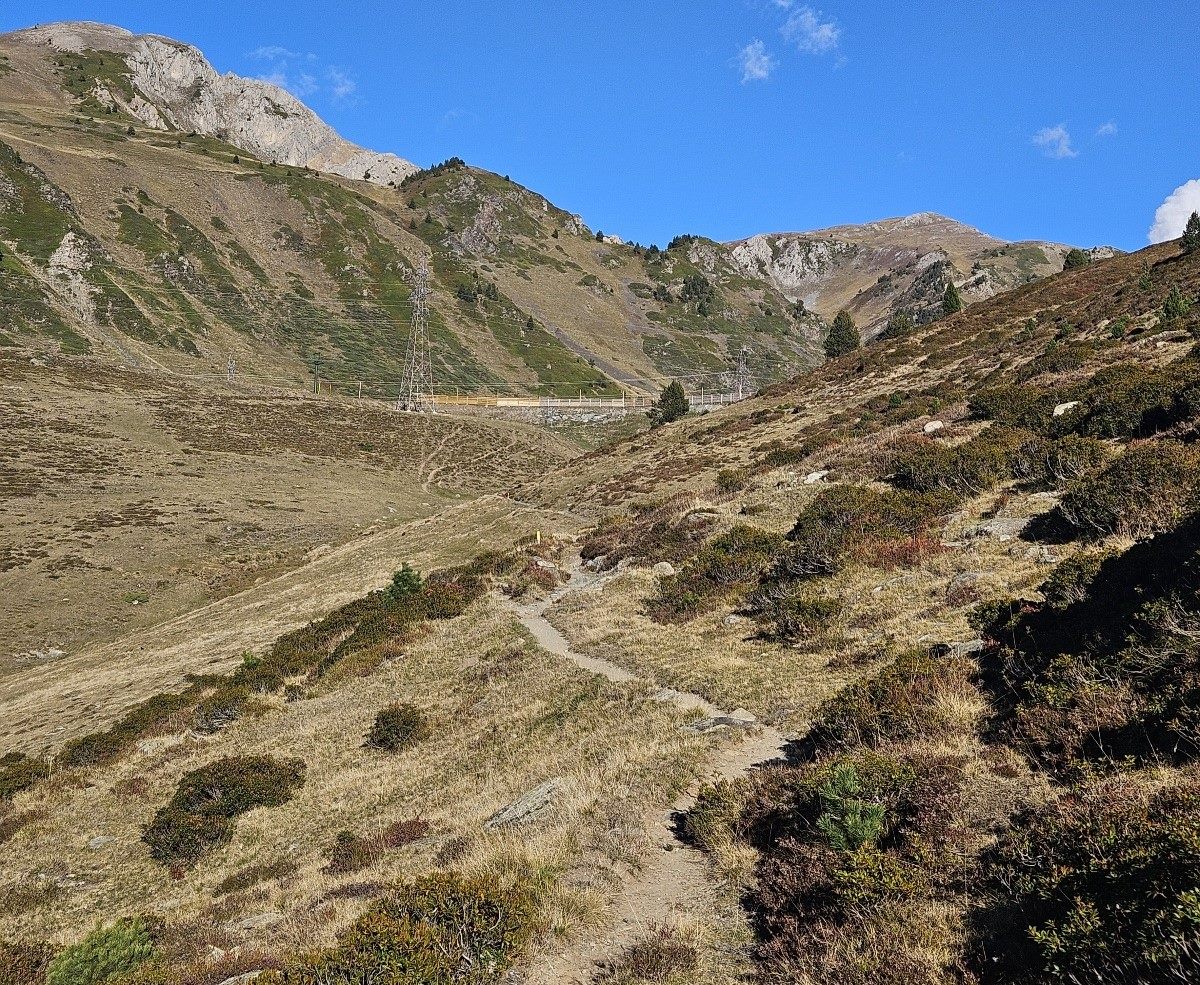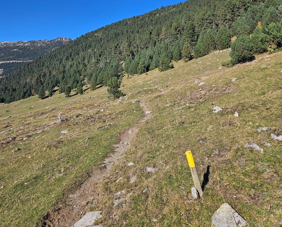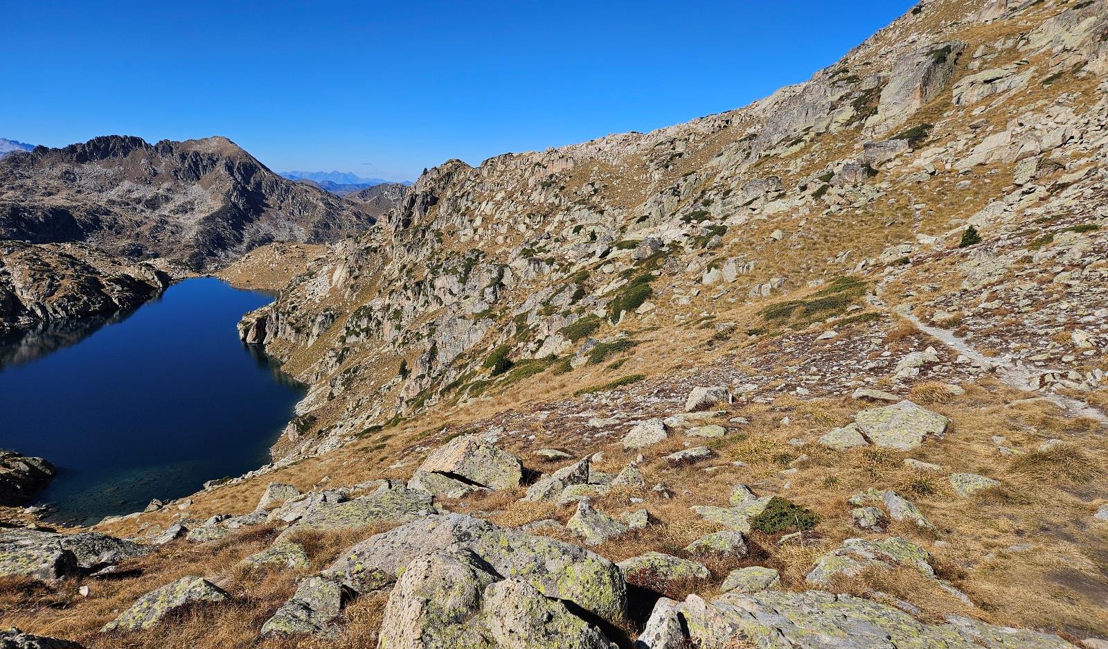 The path descends towards the right-hand corner of the lake, but starts to ascend again before reaching the shore, heading above the tail-end of the Estany Major.