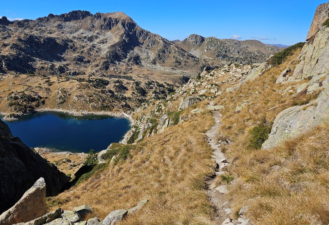 It’s a terrific path which leaves the pass, almost flat and curving round, high above the Estanh Gelat lake.