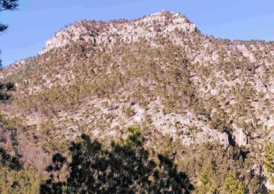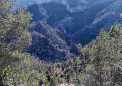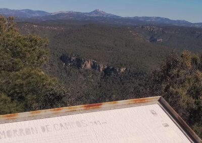 Almost immediately it’s a left turn to head up a short but steep section, emerging at a rock outcrop where there fantastic views across the forested hills to Peñagolosa (1,814m) in the distance.