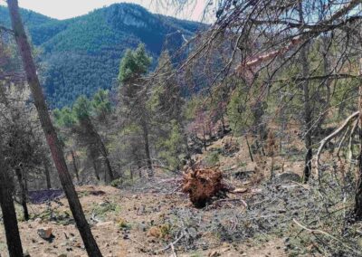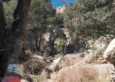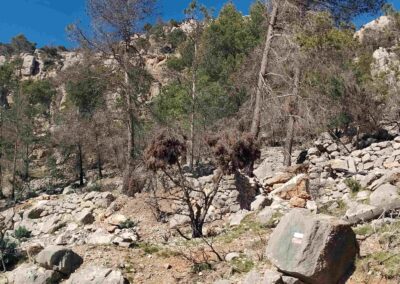 The steep path is well waymarked and there are shady spots in the pines. Reaching an area of rock, there is a fixed wire in place to help with a short section of climbing. Soon after there is zone where many burnt trees have collapsed, obscuring the path. Pick a path around the pine trunks; our route heads more or less straight up the slope. The waymarks are hidden by the debris but there are some cairns to help with orientation. It is around 100 metres in distance through the burnt area to reach the next waymark, which is on a rock (see photo).