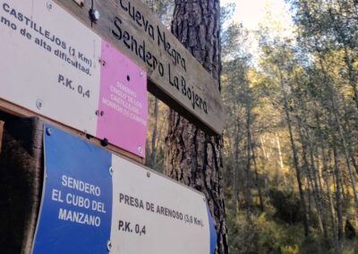 The route starts from the meeting point on Carretera de Tales in Montanejos, just before the bridge over the Maimona river. Cross the bridge and walk on the pavement up the side of the road for around 50 metres. See the signposts on the left; head up the steep bank to reach another set of signs, turning right here for Presa de Arenoso (Arenoso dam) on the blue route.