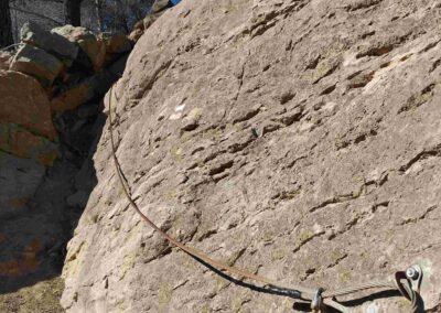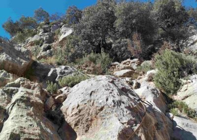 The path approaches a section of steep ascent, up a passageway through the rocks. There are small steps cut into the slope to help with the climb. Next up, a fixed metal wire offers help on a short section of rocks. The path then goes to the left, before bearing round to the right, passing a cairn and into shady pines.