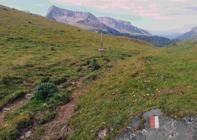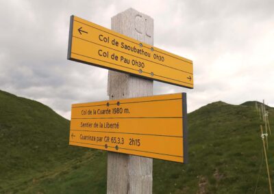 The next point on the map is the Cunarda pass (Portillo de la Cunarda in Spanish – or Col de la Cuarde in French) at 1,980m. This is also on the ‘Liberty’ route which was followed by Republicans freeing Franco’s fascists. A plaque marks ‘the way to freedom’. It’s around 1km to reach the next pass – the path drops below the ridge on the way to the Col de Saoubathou, which stands at 1,949m. From this pass, the path continues below the ridge on the France side, now following the signs for the Arlet refuge. After some undulations it comes to the Cabane de Lapassa, a farmstead where there are animal pens for livestock. The path passes on the right-hand side. Signs tell us that it is 30 minutes more to reach the Arlet glacial lake. The route on the HRP – following the white/red waymarks – continues to be magnificently verdant.