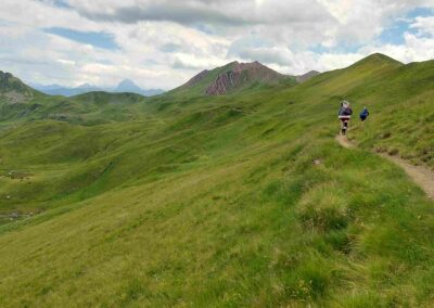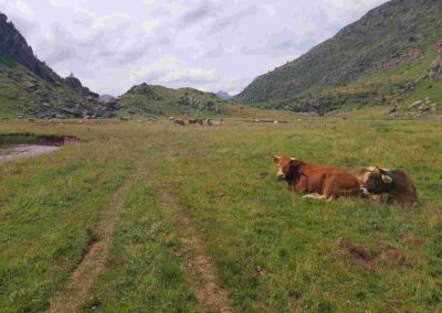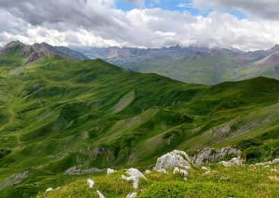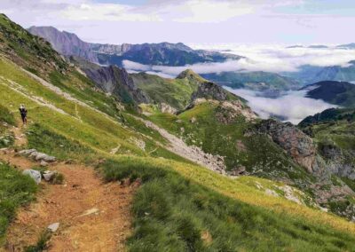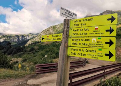 This hike from the Selva de Oza is a wonderful walk through incredible mountain country. The remarkable ridge path comes after the ascent to the Palo pass (Puerto de Palo in Spanish; Col de Pau in French) at the Spain-France border. The path at around 2,000 metres follows the wide, grassy frontier for several kilometres to the Arlet glacial lake and mountain refuge. Including the Palo, the route crosses no fewer than five mountain passes, although three of them are ‘minor’ and barely detectable as such.