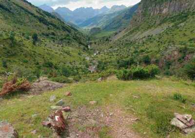 At first rocky, the route becomes grassy as it loses height. The path passes across the shallow Barranco de Acué ravine and doglegs right to complete the final section of the descent to the flats below. The Aguas Tuertas – at around 1,600 metres – can be a bit boggy. It is best to go straight across to the far side, crossing the stream where possible, which will involve removing shoes and socks. On the other side is the GR-11 long-distance footpath. Bear right to follow the trans-Pyrenean route for a couple of hundred metres to the corner, where there is a shepherd’s hut on a rocky outcrop at a spot known as Achar de Aguas Tuertas. This is a good place for a sit down in the shade. You may even want to have a dip in the stream to cool off.