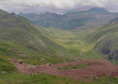 The pass stands at 2,098 metres, which is the highest point of this route. There are panoramic views, with the most captivating being the sight of Bisaurín (2,670m) across the valley which still had snow on its north face in mid-July. Down below is Aguas Tuertas – a flat area criss-crossed by streams (with one large one) which provides great grazing for cows. It looks like a nasty, steep descent at first glance. However, it’s not too bad. From the pass bear left to follow the path, heading towards the valley below. There are small cairns to help with orientation and also red dots. After initially heading directly towards what appears to be a precipice, the path veers left – this allows a more gradual descent across the mountainside.