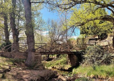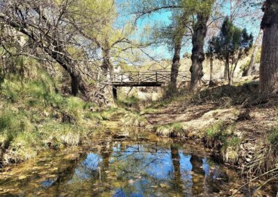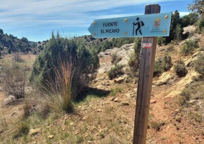 At a field, follow the path along the right-hand side, keeping an eye out for the waymarks. The path bears right, initially through trees before the countryside opens out once again. The path makes its way to the head of a very shallow ravine. And reaches a verdant spot – the Fuente el Picayo. Here, at the natural spring, there are pools with amphibian life. The path keeps to the right of the water, following the right-hand side of the shallow ravine.