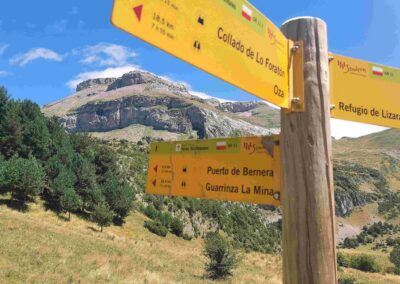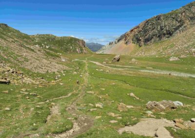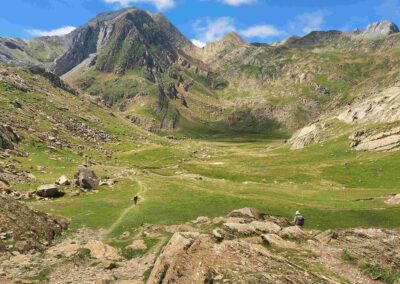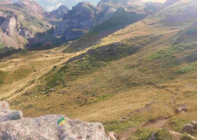 It is 5km from Lizara up to the next pass, the Puerto de Bernera at 2,115m, passing through another fantastic mountain area. The path climbs to the wide entrance to the Bernera ravine, and bears left to ascend along the left side of the wide gulley. The terrain alternates between grassy and stoney before emerging at a stone shelter, the Cubilar de Bernera. It then crosses the stream for a short, grassy ascent to Plana Mistresa; a lovely area of green pasture. Bear right to start the ascent of the beautifully verdant Barranco de los Castillones. On the way up, look back to view the highest summit in the area, Bisaurín at 2,670m.