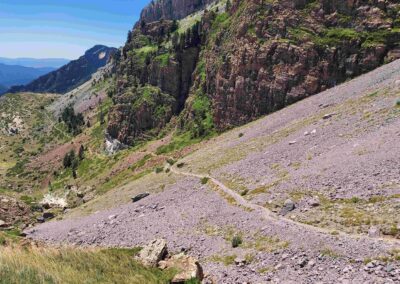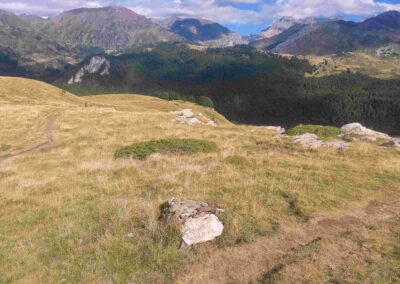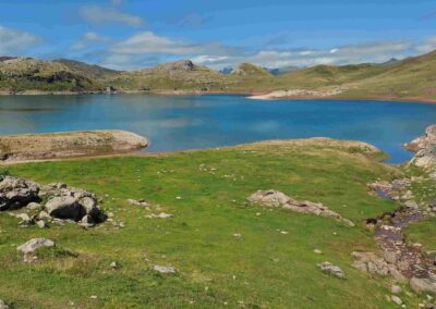 The path drops down towards the Estanés lake. However, an area called La Trichera (the trench) and high ground behind it blocks the view. The GR-11 enters the verdant trench and bears left to traverse to a point, where a climb starts. Here, our route turns right, leaving the new GR-11 behind and taking the path of the old GR-11, which is no longer signposted. The path heads down to the lake and turns right. But the shore is rocky and the path has to climb to advance above the lake before dropping down the other side. The old GR passes the top corner of Estanés and ascends the short distance to the pass of the same name at 1,792m. The descent the other side is another very enjoyable section.