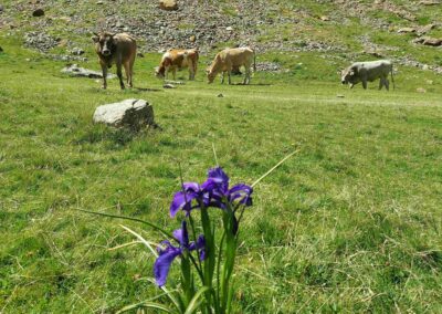 The GR-11 path emerges at the Bernera pass, which is not really recognisable as such, apart from the post which marks it. It is hard to imagine a more lovely valley but there is another of equal beauty to follow. The path now descends the Valle de los Sarrios, which is grazed by cows with mountain flowers adorning the carpet of grass. Under clear skies, after leaving Castillones and Sarrios behind, it is hard not to feel a huge debt of gratitude to the natural world.