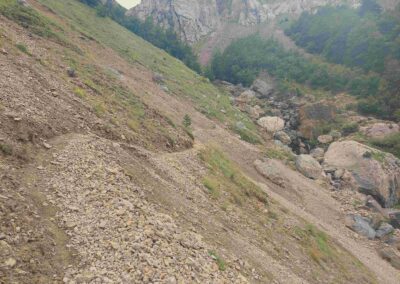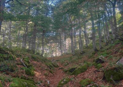 The trail becomes grassy as it goes down. A decision has to be made on the way towards the Sansanet car park in France. After more than a kilometre of the descent, the old GR-11 bears sharp right at a turn which is easy to miss, although there is a cairn on a rock and green/yellow waymark. The walker can now follow the old route, or head into France and make use of the map to find a path back to Candanchú. Our route continues on the old GR-11, heading towards the collosal Aspe cirque which was seen close up on the early part of the walk. The path heads down and across, keeping its height after the initital drop. It enters a magnificent woodland on an undulating path before emerging at a point which crosses the Aspe ravine. This is where the erosion has occurred and great care has to be taken. However, this is a very short section and the subsidence can be negotiated on a path which goes down for a short distance and then ascends to meet back up with the original route.