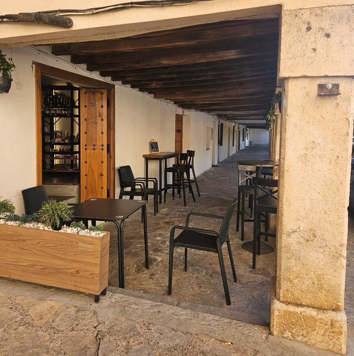 Part of the plaza has a colonnaded walkway which provides shade for shop and bar fronts.