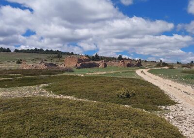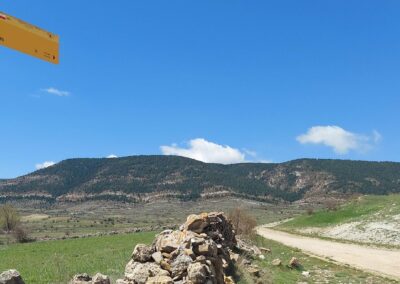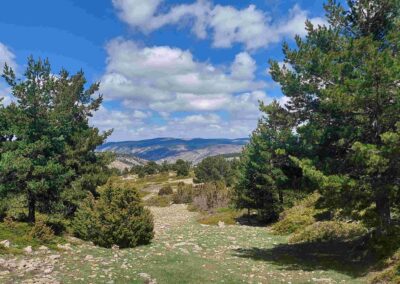 The GR-8 soon returns to a track, ascending through a high mountain area, where there are great views and more pine trees. Emerge at a wide track and bear right. Walk along the track for less than 500m to reach the next junction and bear left, turning off just before the tumbledown farmstead (masía). The track is now heading ‘cross country’ and the walker should be alert to the next turn off. The junction is well before the trees. Bear right here to continue ascending into the trees. A waymarked track passes through the pines and goes as far as the mountain road, where a sign tells us we have come 6.5km from Fortanete. This the highest point of the walk at an altitude of nearly 1,800m and is close to the rounded summit of Tarrascon (1,813m).