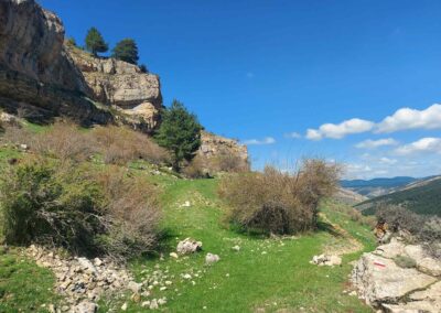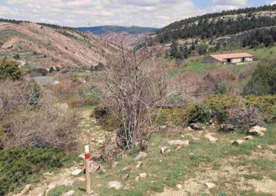 There is a short section along the side of the ravine before the path crosses a stream and ascends to meet the mountain road which runs to Valdelinares. Turn right and walk up the road for a little under 1km. Arrive at a GR-8 sign which tells us we have come 2.7km from Fortanete – the sign points off the road, and down then up the bank, to start a waymarked ascent. The path reaches some farm buildings. Pass to the right of them. The next short section is slightly tricky as cattle have knocked down some of the walking signs. In essence, you are ascending straight up but bearing slightly to the right on the climb – first on grass and then on the path through the shrubbery (see the photo).