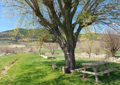 The track turns into a path and passes a large shady tree which has a picnic table underneath. It may be a little early to be stopping for sustenance, although some people may want a short walk from the village to this point. The path starts to rise, moving towards a wooded area where signs give information on the types of pine trees and other flora which can be found in the area. Moving towards the trees, the path enters a shallow ravine, the ‘arroyo de Peñacerrada’.
