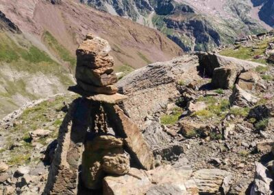 The cairns show the walker up a switchback path, which is rocky and covered with loose stones.