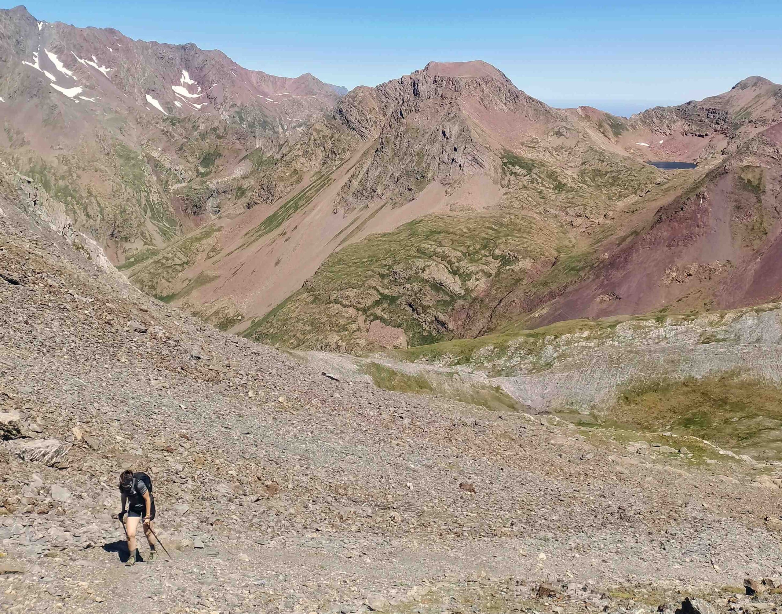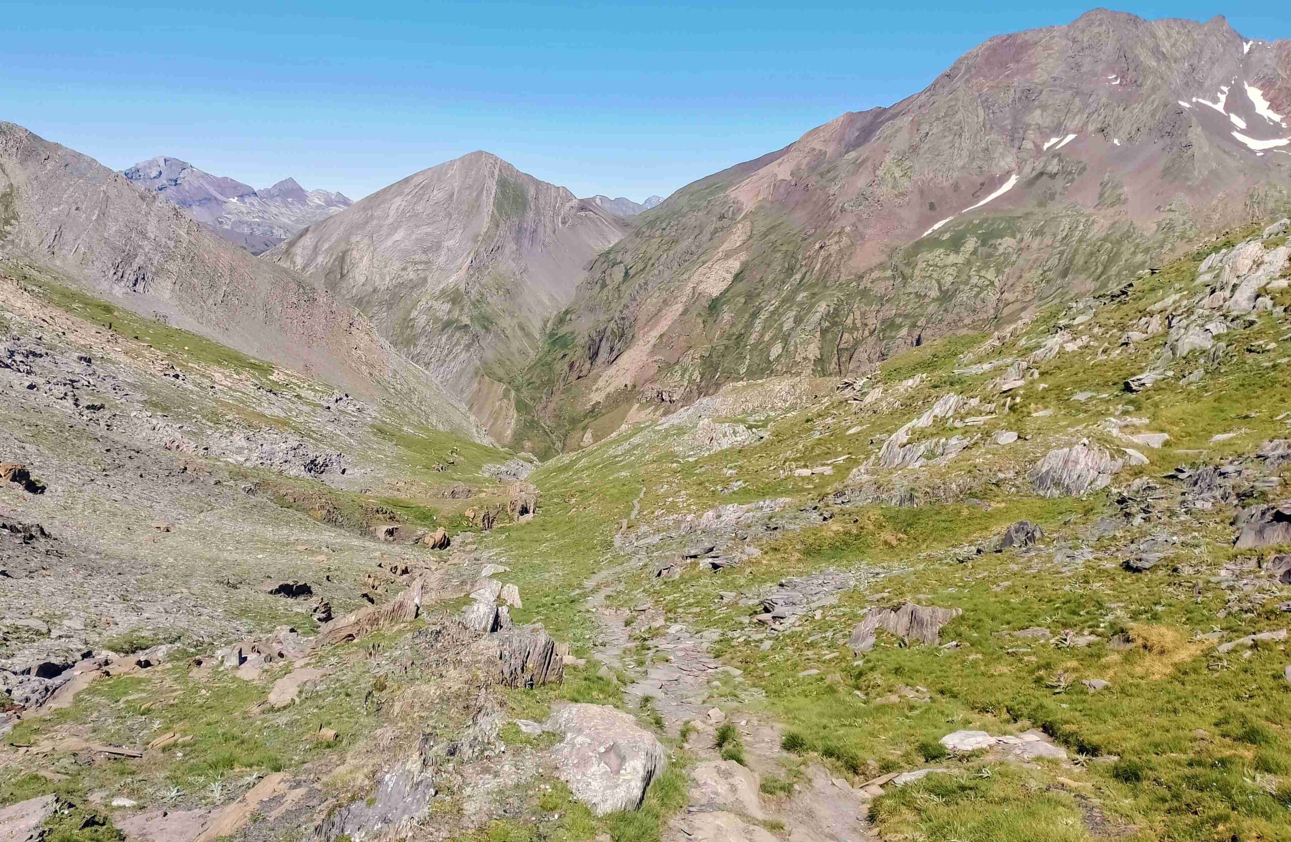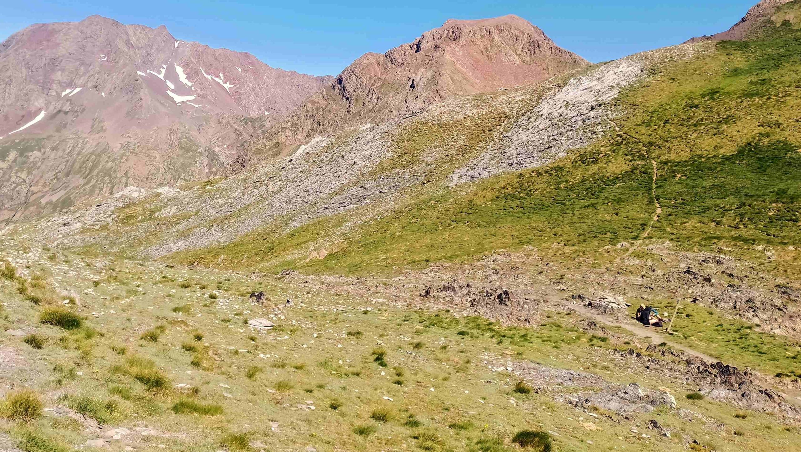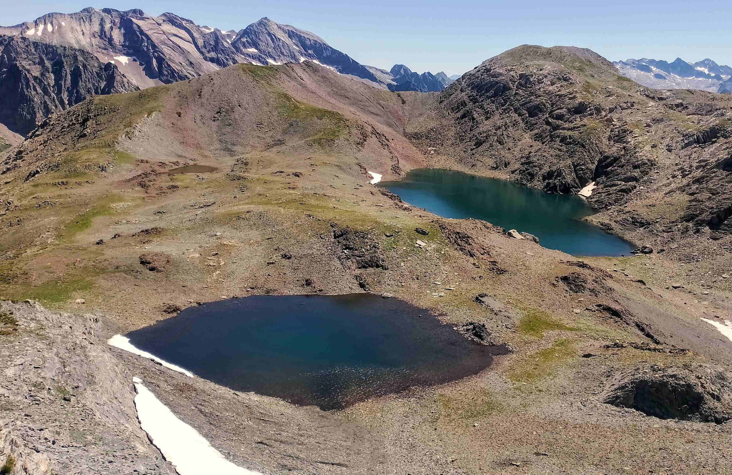 It is possible to walk down to the lakes and then skirt back round to the cairned path; or go back exactly the same way to the pass and return to Viadós on the GR-11.