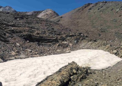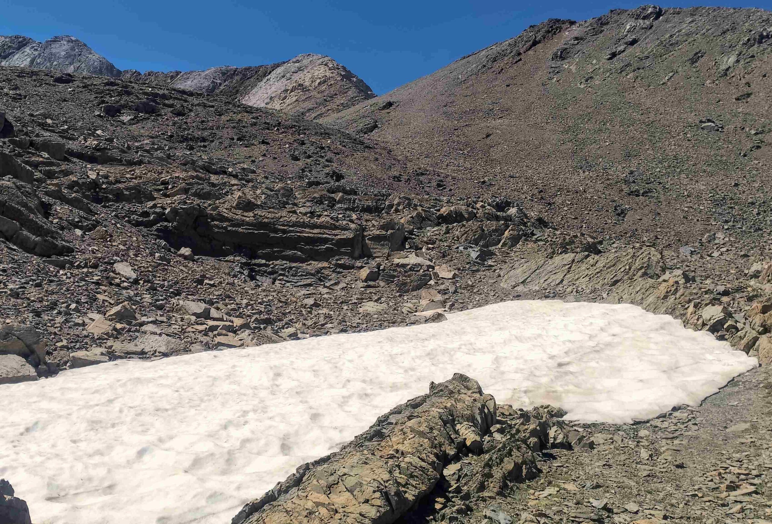 As the path climbs above 2,700 metres the landscape becomes lunar and some snow remained on the ground in mid July.