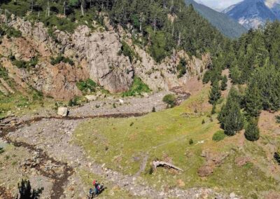 Enjoy the views across to the awesome Posets massif, with more than a dozen summits over 3,000m. Pavots mountain is dead ahead and our route up the Val de la Ribereta ravine can be seen to the right of it.