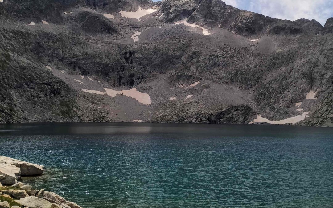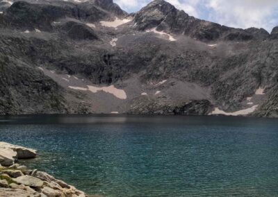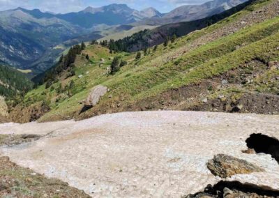 In mid-July, areas of deep snow remained in the upper reaches of the north-facing Val de la Ribereta, with the waymarked path ascending towards the lakes.